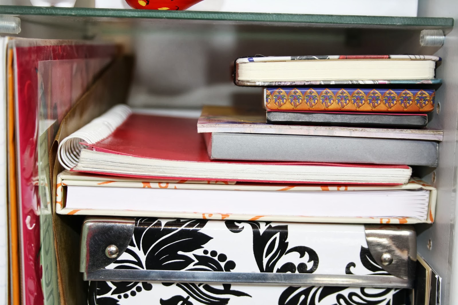 | Tous mes petits carnets sont rangés à cet endroit. Chacun a une fonction bien précise: carnet d'inspiration, notes en tout genre, croquis pour mes tatouages etc. |