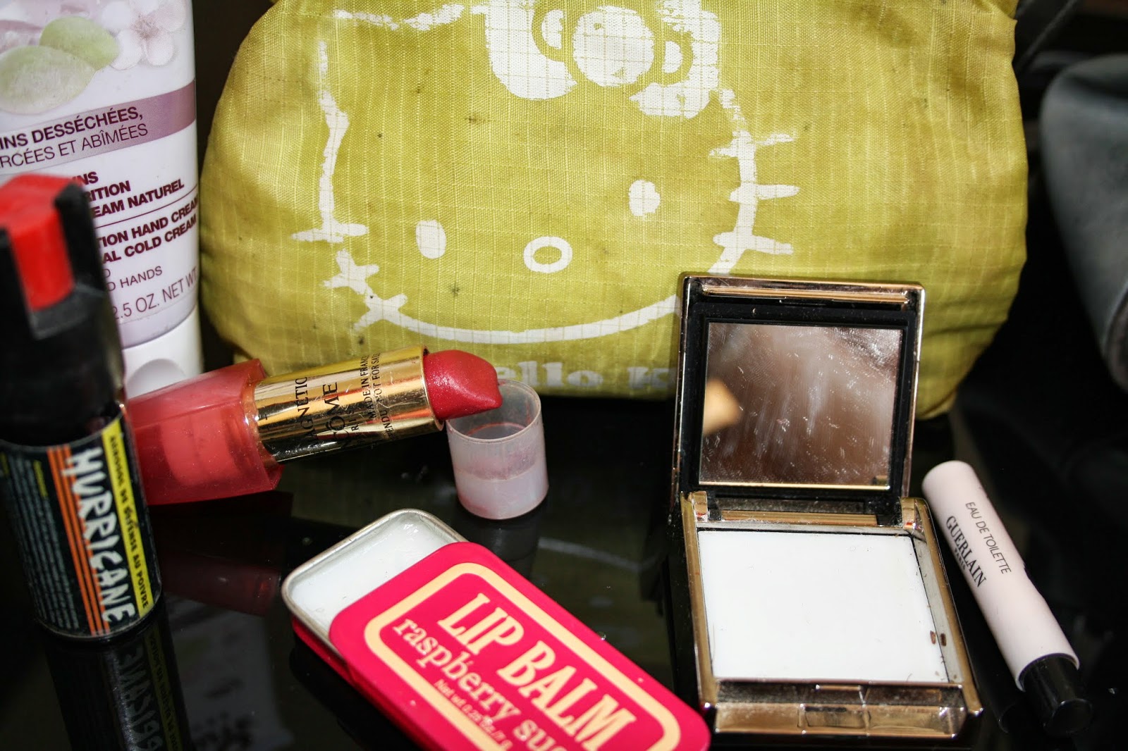 | Trousse Hello Kitty de chez H&M Crème pour les mains de la gamme Bio de chez Nuxe Baume à lèvres H&M RAL de chez Lancôme Baume matifiant ELF Echantillon La petite robe noire de Guerlain |