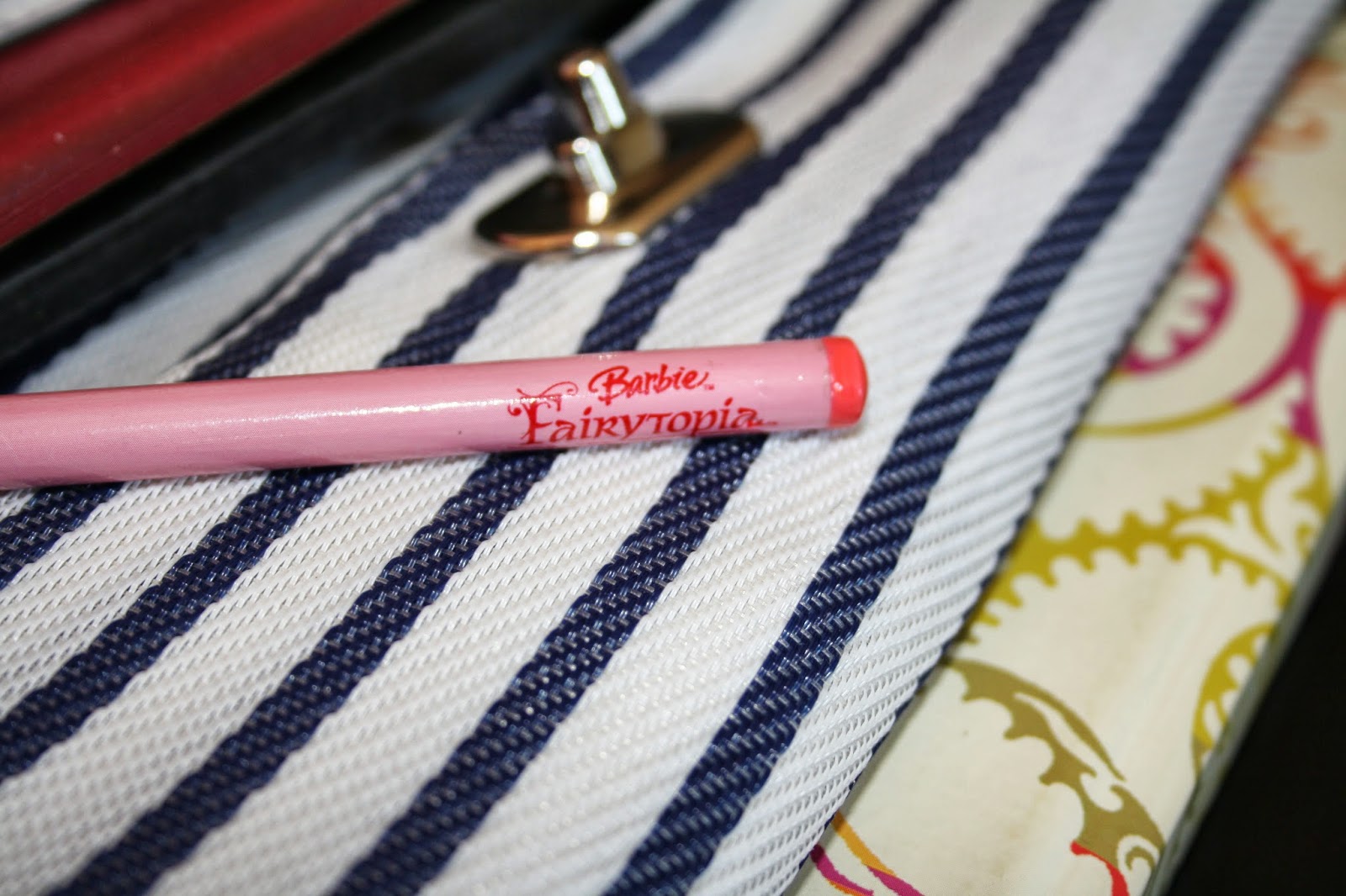 7 - Mon sac contient également cette petite pochette rayée qui centralise tous mes carnets, mon chéquier, mes papiers de voiture. Ca évite que tout soit éparpillé ! J'ai également toujours sur moi un crayon à papier et un stylo. En ce moment, c'est un crayon Barbie que j'ai retrouvé dans un vieux placard ! J'ai également sur moi mon carnet d'inspiration qui risque de ne plus me quitter pendant un bon moment ! Cela me permet de noter tout ce qui me passe par la tête ou des idées pour ma future boutique.
