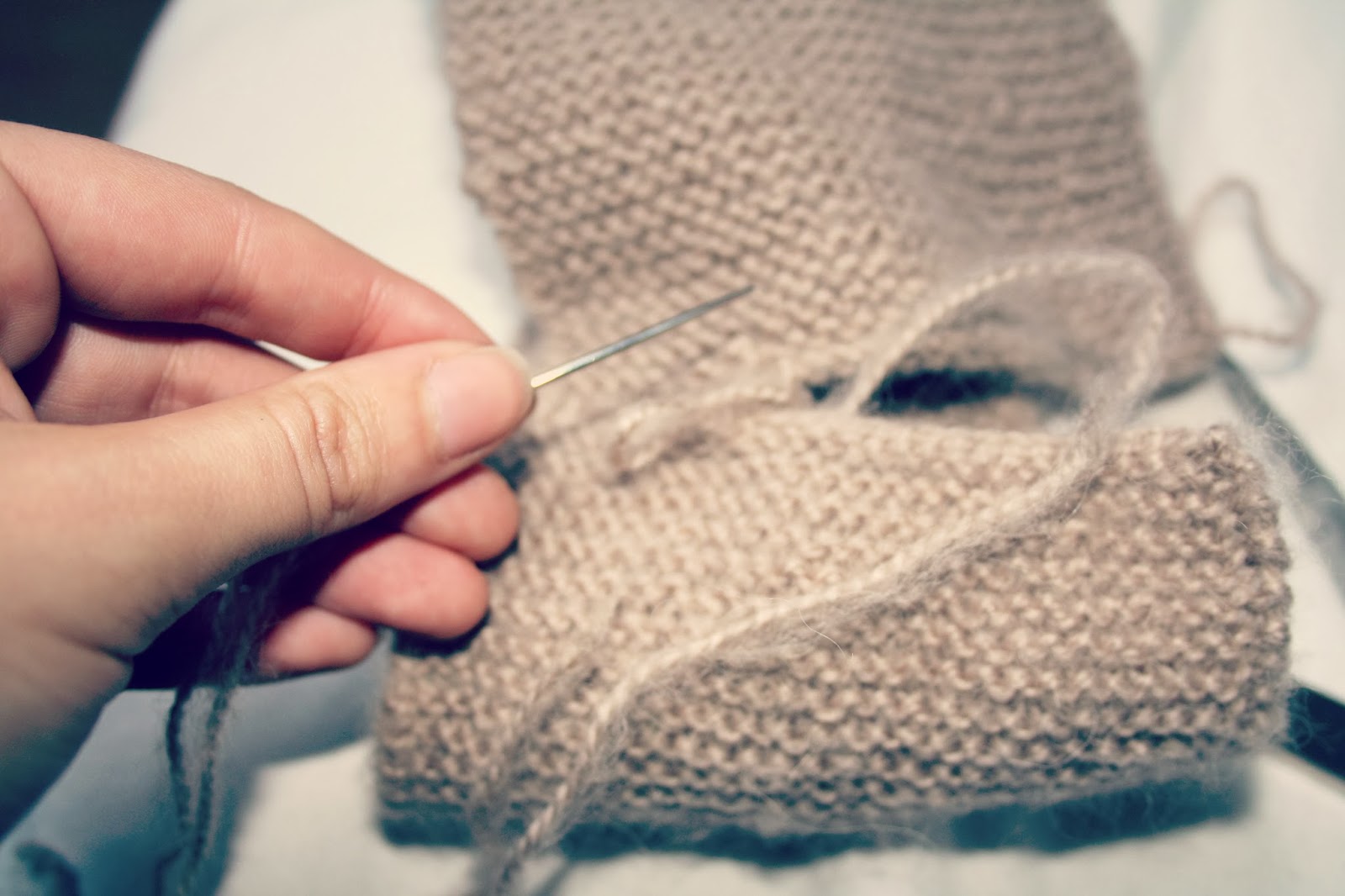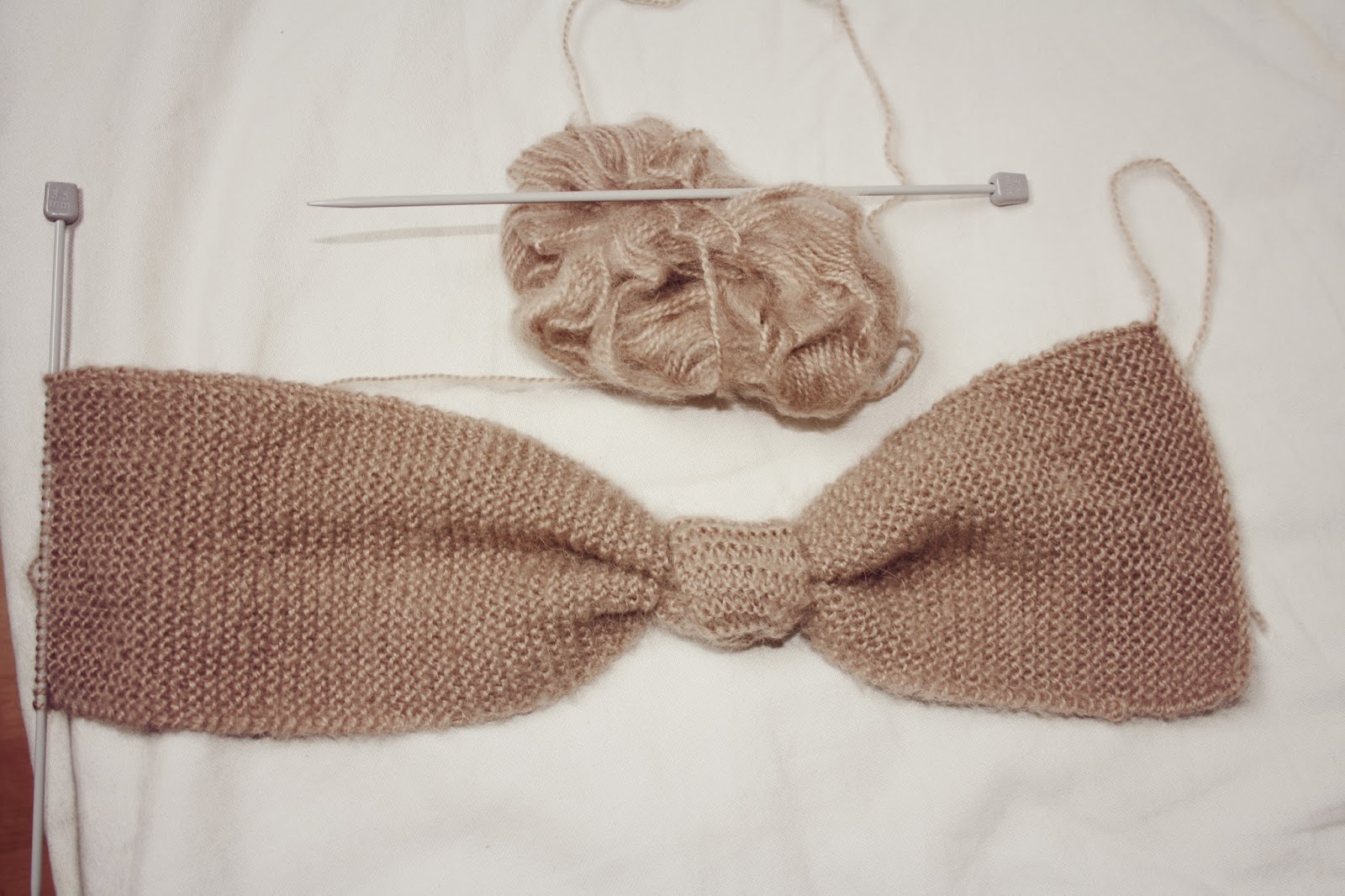 ♥ Une fois que vous avez obtenu une bande de la longueur de votre tour de tête, vous pouvez terminer votre tricot ♥ Faites un joli noeud bien centré ♥ A l'aide de votre aiguille à laine, vous pouvez désormais coudre les deux côtés de votre bande